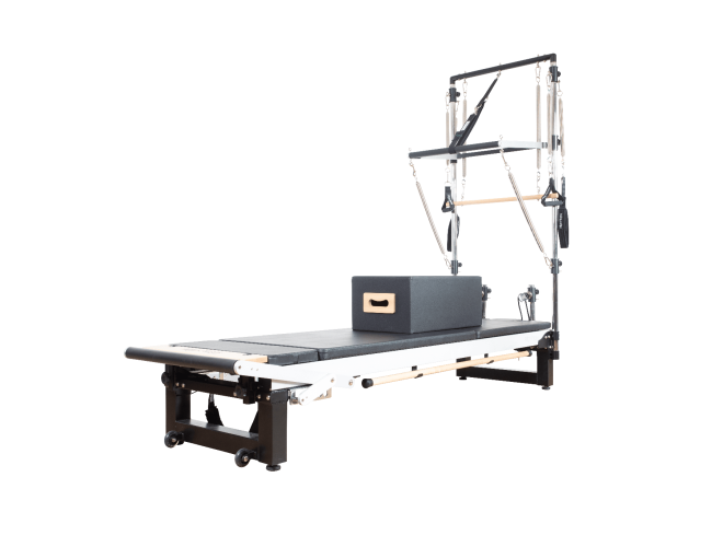 This version of the A8-Pro reformer comes with a Half Cadillac Frame which includes the A8-Pro Pilates Reformer With Standard Legs, Half Cadillac Frame & Brackets, Mattress Converter, Platform Extender, as well as reformer accessories: Sitting Box and 60″ Maple Gondola Pole – all you need for a complete Pilates Reformer & Half Cadillac combo. The full stainless steel upper frame is superior to standard chromed steel frames, ensuring a long and corrosion free life. Max. user weight: 330lbs | 150kg.