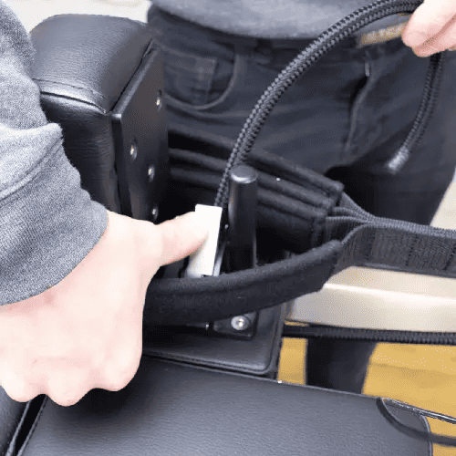 The R8-Pro comes with four springs and uniquely has space for adding an optional fifth spring. It also includes our patented Rapid Change spring bar with three spring bar positions for quick and seamless carriage position adjustments. The R8-Pro ropes can also be quickly adjusted using our Pro Rope adjusters that conveniently sit behind the shoulder rests.