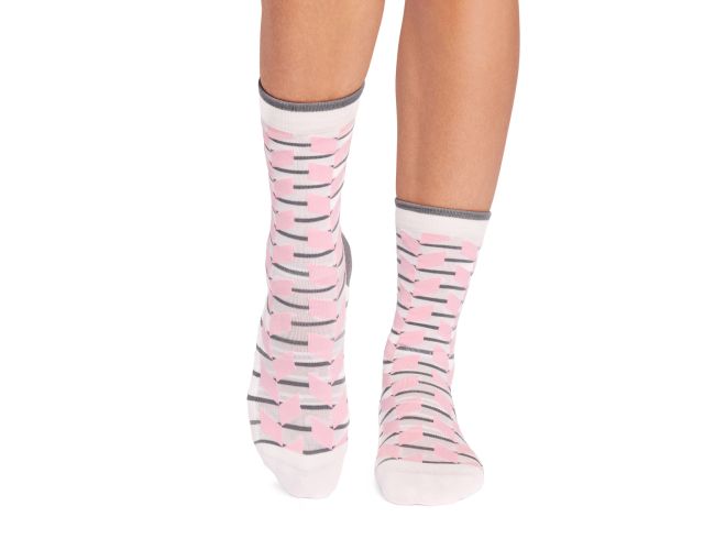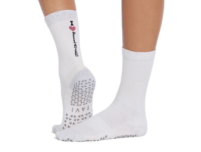 Jess Grip Socks is a trendsetter with a lovely anklet height. The anklet height falls between the ankle and calf while Tavi's grip sock pattern safely moves you through your barre, Pilates and yoga classes.